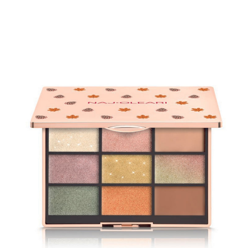 NAJ SPARKLING FOLIAGE PALETTE OMBRETTI Palette con 9 ombretti multifinish perfetta per rendere lo sguardo protagonista. Grazie al contrasto di toni delicati e intensi declinati in finish glitter, matte o satinati, i look da realizzare sono infiniti, dai più naturali ai più stravaganti. Le texture ultra pigmentate garantiscono un risultato intenso assicurando il massimo comfort senza fall-out. Facili da applicare e sfumare, sia con un pennello che con un dito, gli ombretti si fondono perfettamente con la palpebra. Oftalmologicamente testato