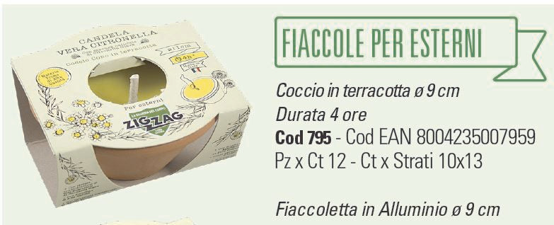 Candele con elevata percentuale di olio essenziale di Citronella Giava, paraffina di alta qualità, stoppino antivento di puro cotone (senza piombo e nylon). PER ESTERNI